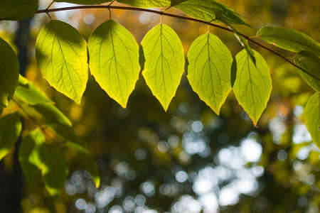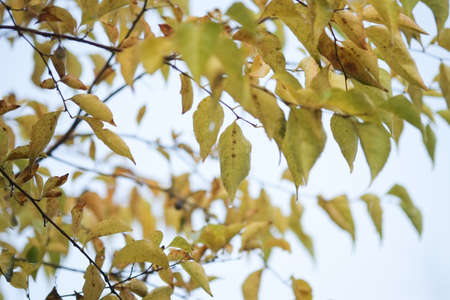 Leaves, which begin to turn yellow, on the branches of a tree. The beginning of autumn