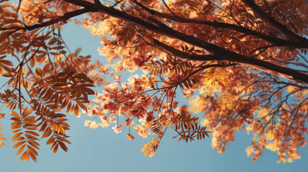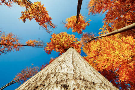 A breathtaking and stunning view of autumn trees displaying vibrant leaves set against a clear blue sky