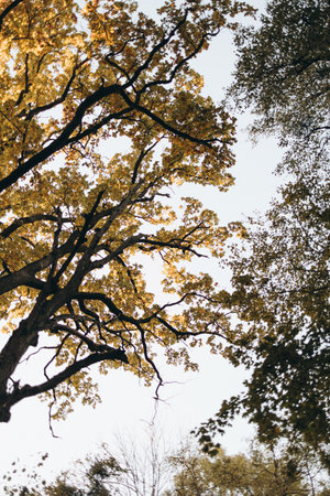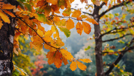 Golden autumn leaves on tree branch in a tranquil forest setting during fall season