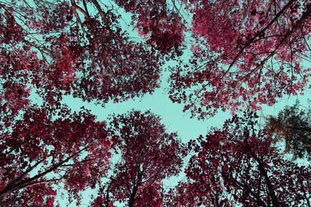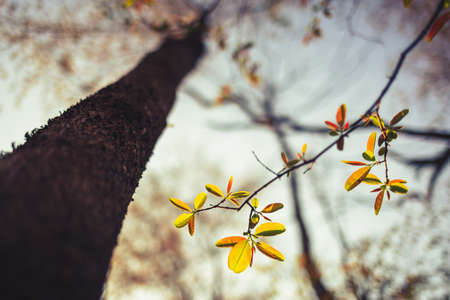Leaves change the color on the branch beside the high tree in the forest, vintage color style
