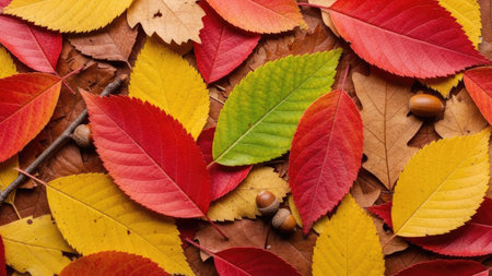 A detailed close-up of the forest floor covered in a vibrant carpet of fallen red, yellow, and brown autumn leaves mixed with acorns and moss.