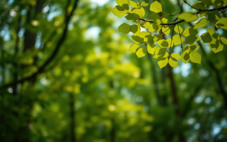 Sunlight filters through vibrant green leaves in a peaceful forest during springtime