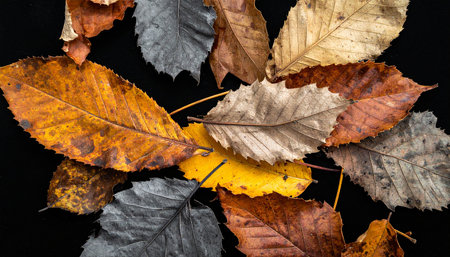A close-up view of a collection of vibrant autumn leaves on the forest floor, showing the beautiful hues of the changing season.