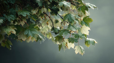 The Sycamore maple in light fog, dew on leaves, light soft diffused, three-quarter view