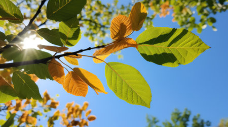 Sunlight filtering through yellow autumn leaves hanging from tree branches in a forest. Ai generated image