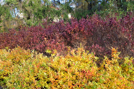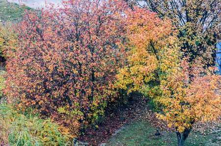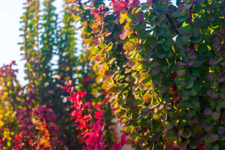 autumn colors composition in garden, beautiful colored ornamental shrub,
