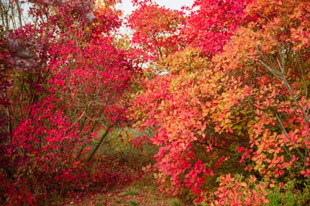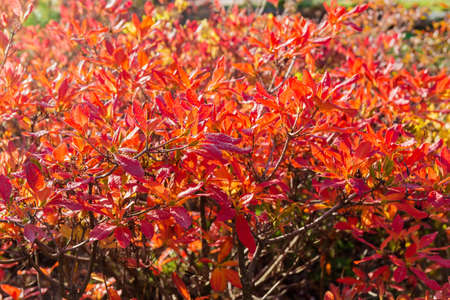 Shrubs of deciduous rhododendron with bright red autumn leaves close-up in selective focus