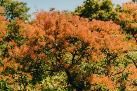 Vibrant orange leaves on a tree in a lush garden during late afternoon sunlight