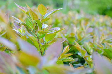 Discolored background of natural foliage of bush. Organic greenery monochrome image as backdrop or wallpaper. soft focus. horizontal orientation.