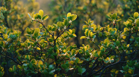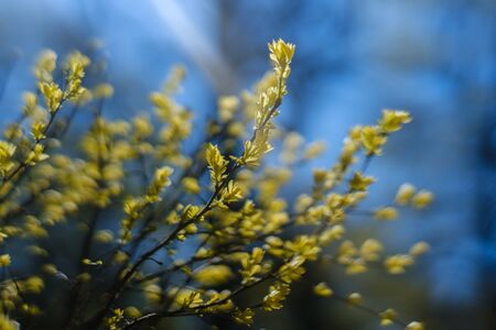 Nature in springtime with young leaves on bush branches. Spring bush with new leaves in forest. Nature wallpaper blurry background with green leaves of soft focus