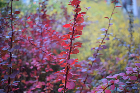 Mess of blurred and focus berberis thunbergii branches with dark red leaves. Atmospheric ruby color autumn background with blur place for text