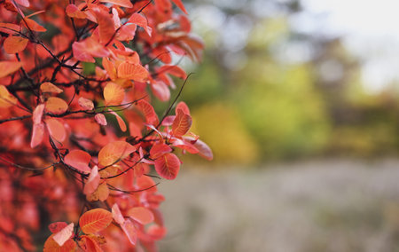 autumn landscape. A bush with red leaves against the backdrop of an autumn forest. Blurred background, shallow depth of field, copy space.