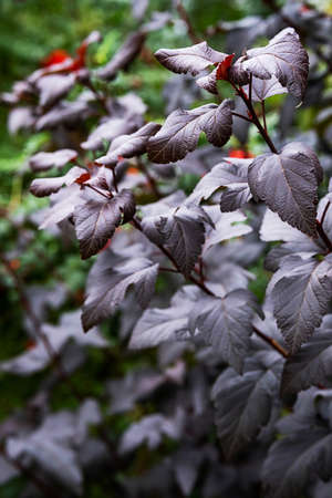 Physocarpus opulifolius diabolo or ninebark foliage, close up, selective focus. Beautiful botany background.