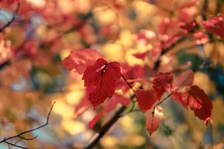 Abstract foliage background, beautiful tree branch in autumnal forest, bright warm sun light, orange dry maple leaves, autumn season