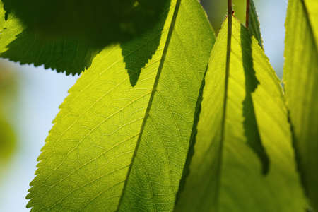 Cherry tree leaves. Spring garden nature. Fresh green foliage. Nature background.