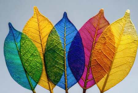 Five colorful skeleton leaves arranged against a neutral backdrop, showcasing intricate veins