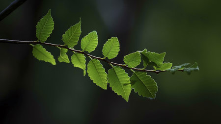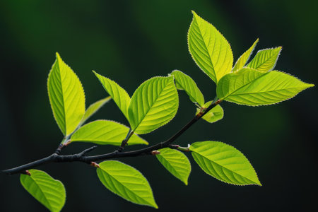 A vibrant green branch with multiple fresh leaves, illuminated by natural light, stands out against a stark black background. The image evokes themes of new life, growth, and nature's simplicity, perfect for design elements and compositions.