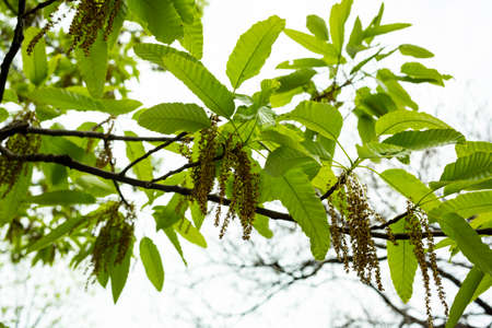 Close-up of lush green leaves of an Ailanthus altissima (tree of heaven, ailanthus, Ghetto Palm, stinking sumac, varnish tree, or Chinese chouchun tree), a Simaroubaceae plant.