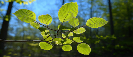 Beautiful, fresh, green leaves in the summer sunlight. Vibrant forest scenery of Northern Europe.