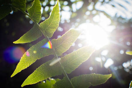 Fern leaf with a water drop humidity on the morning sunlight in the tropical forest.