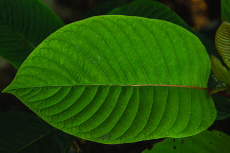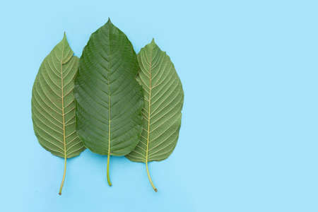 Mitragyna speciosa, Fresh kratom leaves on blue background