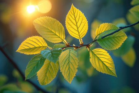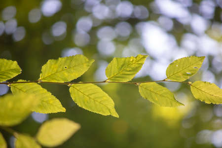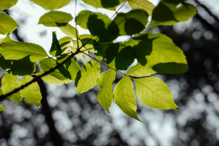 Leaves growing on a tree with sunlight on a bokeh background