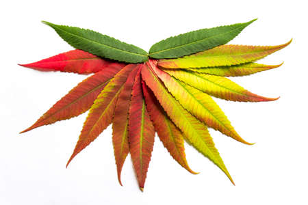 Gradient colored leaves arranged in a half circle. Autumn leaf coloration. Autumn colors - chlorophyll, anthocyanins and carotenoids.