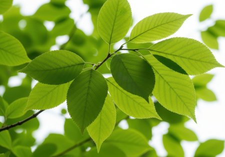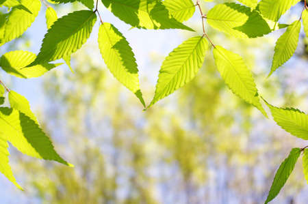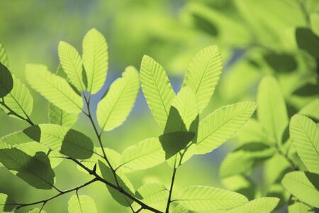 Lush green leaf, purity nature background. Green leaves on elm tree. Nature spring and summer banner. Plants against the blue sky concept. Trees branch isolated on white background