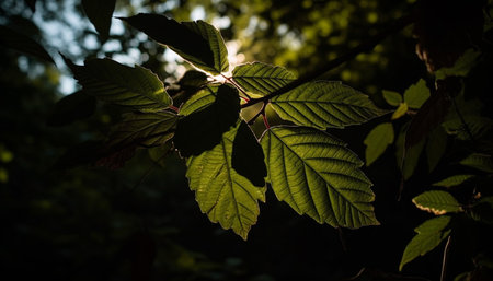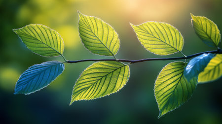 A close up view of fresh green leaves glistening in golden sunlight, showing their intricate veins. The natural light enhances the lush greenery, creating a serene atmosphere.