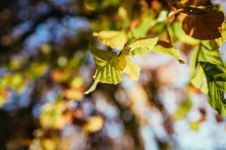 Colorful leaves on a tree in autumn, park flair and blurry background