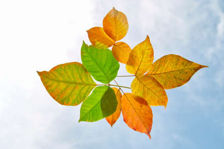 Close up of a different colored leaves in autumn. Blur orange bokeh background