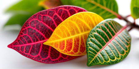 Croton plant branches with bright, colorful leaves displaying unique patterns and textures