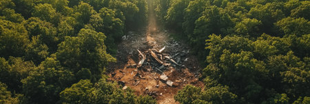 Aerial view reveals wreckage from an airplane scattered among thick green tree cover in a secluded woodland area during daylight.