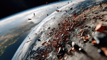 A captivating close-up view of asteroid debris orbiting Earth, showcasing the planet's surface and a dramatic cosmic backdrop, illustrating the vastness of space.