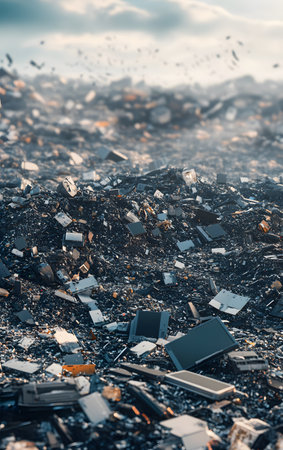 A vast pile of electronic waste stands tall amidst a foggy background, illustrating the growing concern of e-waste pollution and environmental damage.