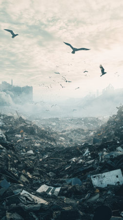 A vast expansion of garbage covers the ground, with numerous birds flying overhead. The gloomy backdrop of the city skyline adds to the somber mood of the polluted environment.