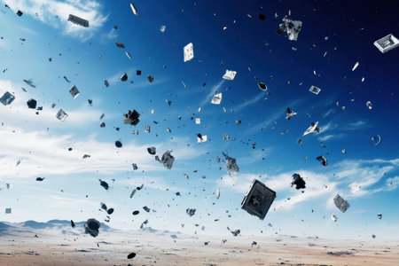 Fragments of various objects are airborne above a barren landscape, under a vivid blue sky with scattered clouds.