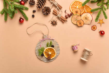 Banner top view of holiday ornament made of Christmas decorations on colorful background. New Year time concept with copy space.