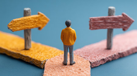 Individual contemplates career choices at an intersection with vibrant clay signs directing toward various paths under bright lighting.