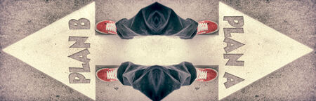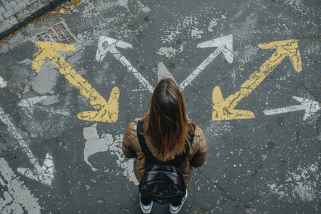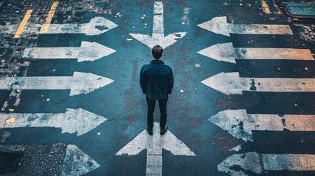 person standing on road with arrow markings pointing in different directions, decision making concept