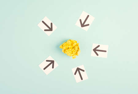 White and yellow arrows on asphalt showing different directions. Painted arrows on road symbolizing choice and direction. Top view.