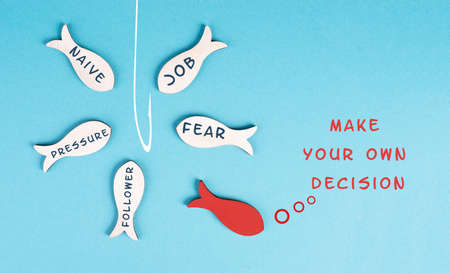 Group of fishes with words like fear, pressure, follower swimming to the fishing rod, red fish makes his own decision, takes a different direction, against the stream