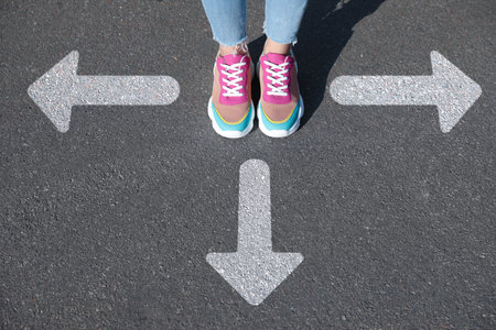 Choice of way. Woman standing in front of drawn marks on the road, closeup. White arrows pointing in different directions