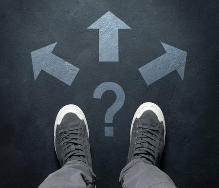 Arrows pointing in different directions, a person standing on the ground wearing shoes, looking down at the arrows pointing towards them. --ar 3:2 --stylize 750 --v 6.1 Job ID: b25a5bde-e90f-4ede-9cc4-eebd77ff79d2