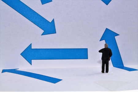 Figures of businessmen in front of blue arrows symbol for direction search and business ideas
