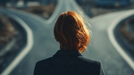 business woman in front of two roads thinking deciding hoping for best taking chance