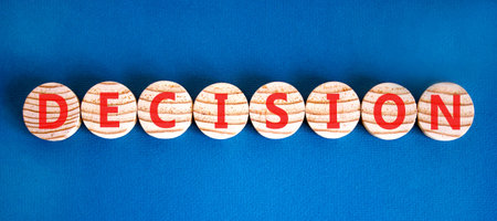 Decision word symbol. Concept word Decision on beautiful wooden circles. Beautiful blue background. Business support help decision word concept. Copy space.