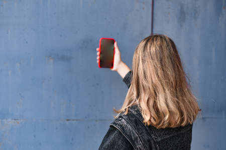 young woman with long tails and in a black denim jacket photographs on the phone a gray concrete background for a photo stock