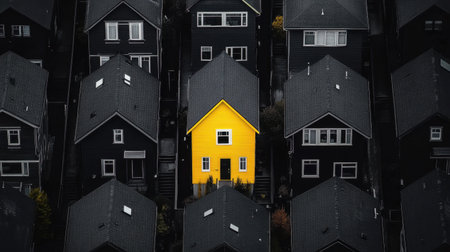 A bright yellow house stands out among black houses in an aerial view, symbolizing individuality and boldness in a striking composition