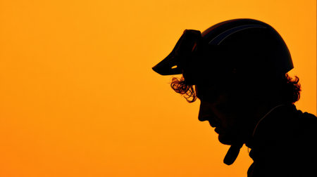 A cyclist in a helmet is silhouetted against a stunning orange sunset, showing the beauty of evening rides and active outdoor lifestyle.